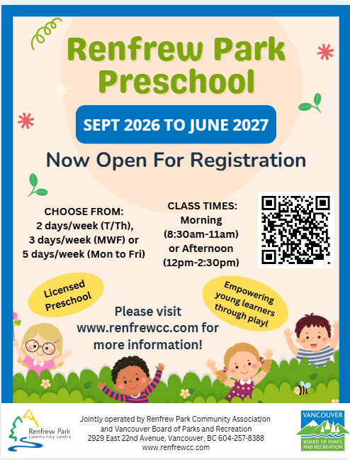 Please note, if your child is not 3 years (but over 30 months old) by the time of registration please email us (renfrew.preschool@vancouver.ca) to request space in our program.